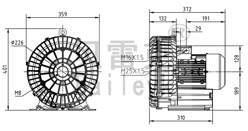 最大風量:345m3/h 最大正壓:195mbar 最大負壓:200mbar 防護等級:IP55 噪音:70db 重量:29Kg