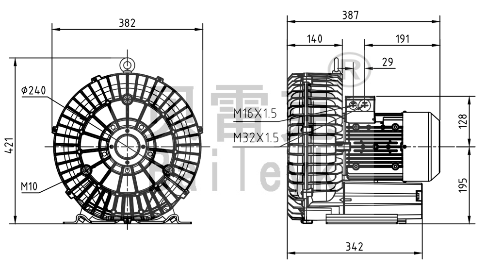最大風量:420m3/h 最大正壓:170mbar 最大負壓:180mbar 防護等級:IP55 噪音:70db 重量:32Kg